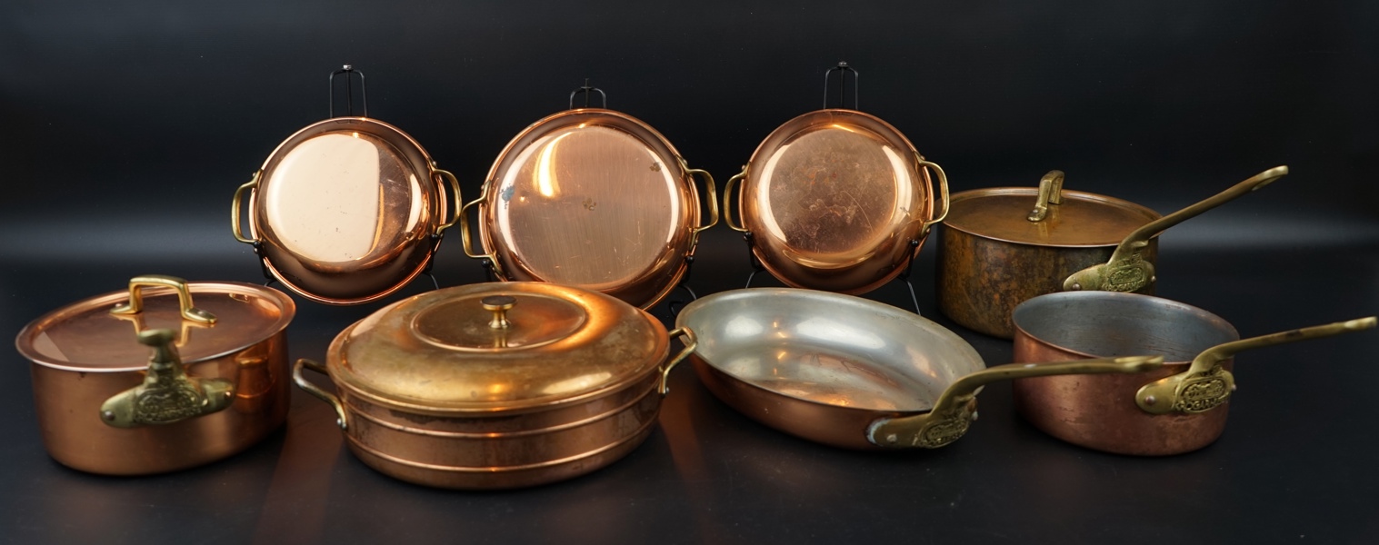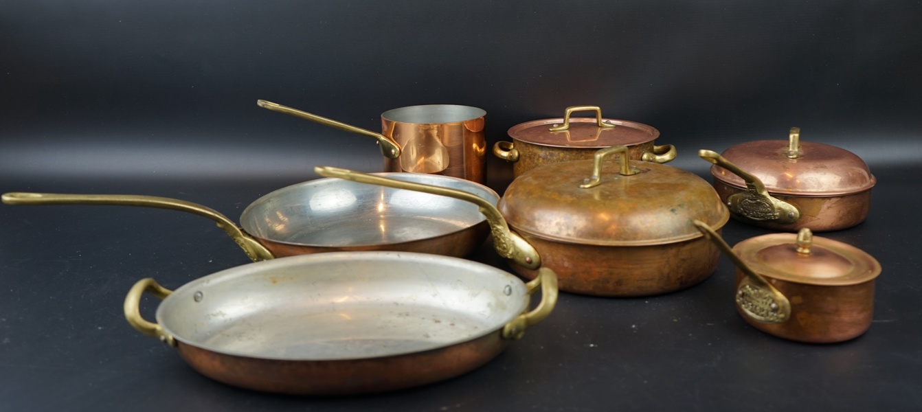 Kastrullar m.m, 8 delar, koppar, bl.a Krögarhuset.