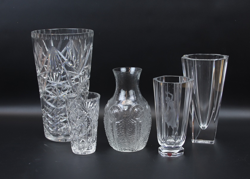 Vaser, 5 st, glas, mest Orrefors, 1900-tal.