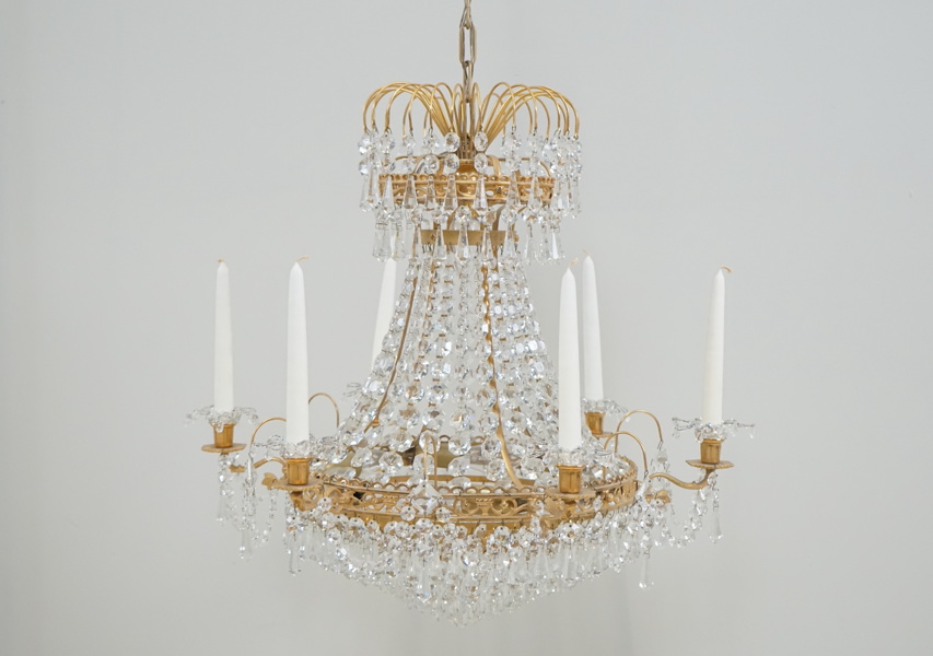 Takkrona, för 6 ljus, 7 ljuspunkter glasprismor, mässing, 1900-tal.