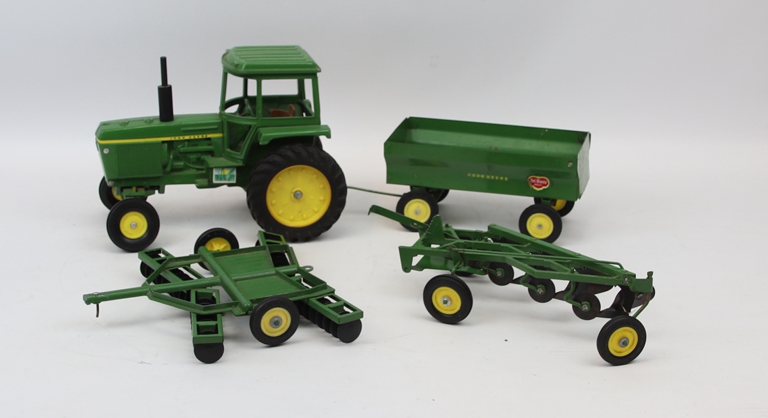 John Deere, traktor och tillbehör, 4 delar, metall, ERTL & Co.